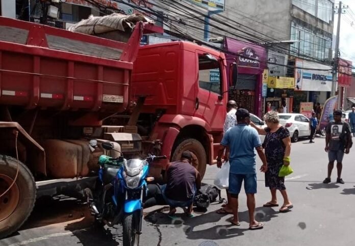Acidente envolvendo caçamba e moto deixa trânsito complicado na Rótula da Feirinha
