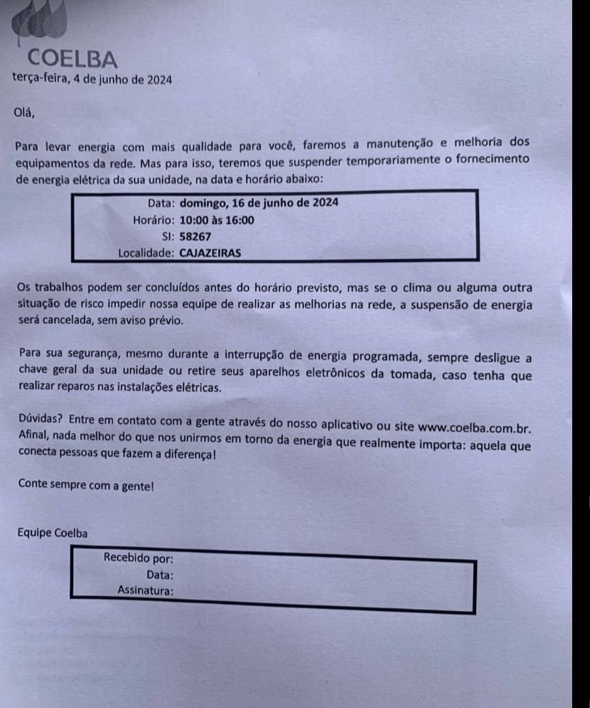 CONFIRA COMUNICADO DA COELBA ABAIXO: