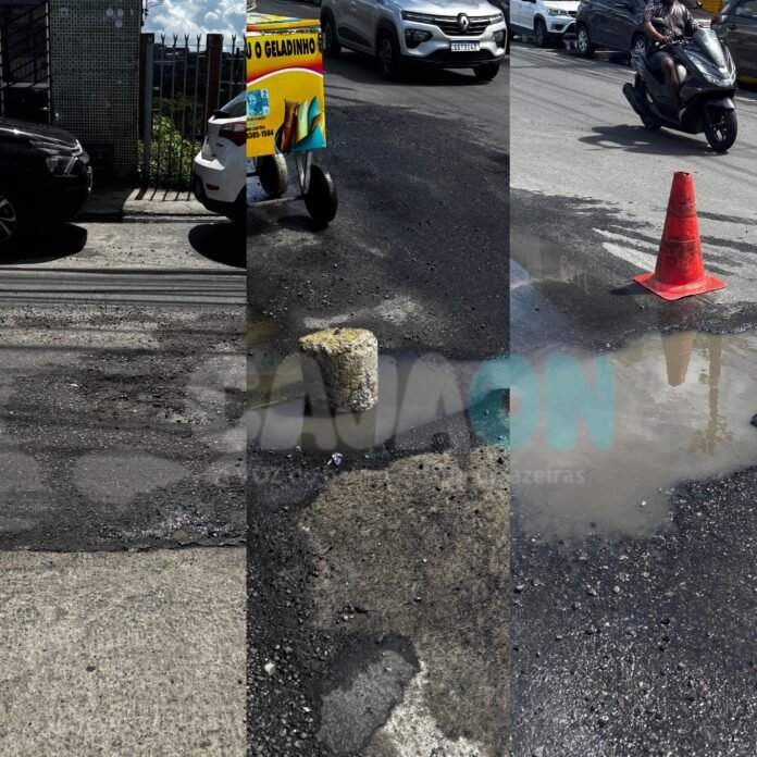 Imagens enviadas ao CajaON mostram trechos do asfalto quebrado, com pontos de acúmulo de água e risco de acidente. Para proteger os pedestres, os próprios lojistas colocaram cones, pedras e até pedaços de madeira para sinalizar os buracos mais perigosos.