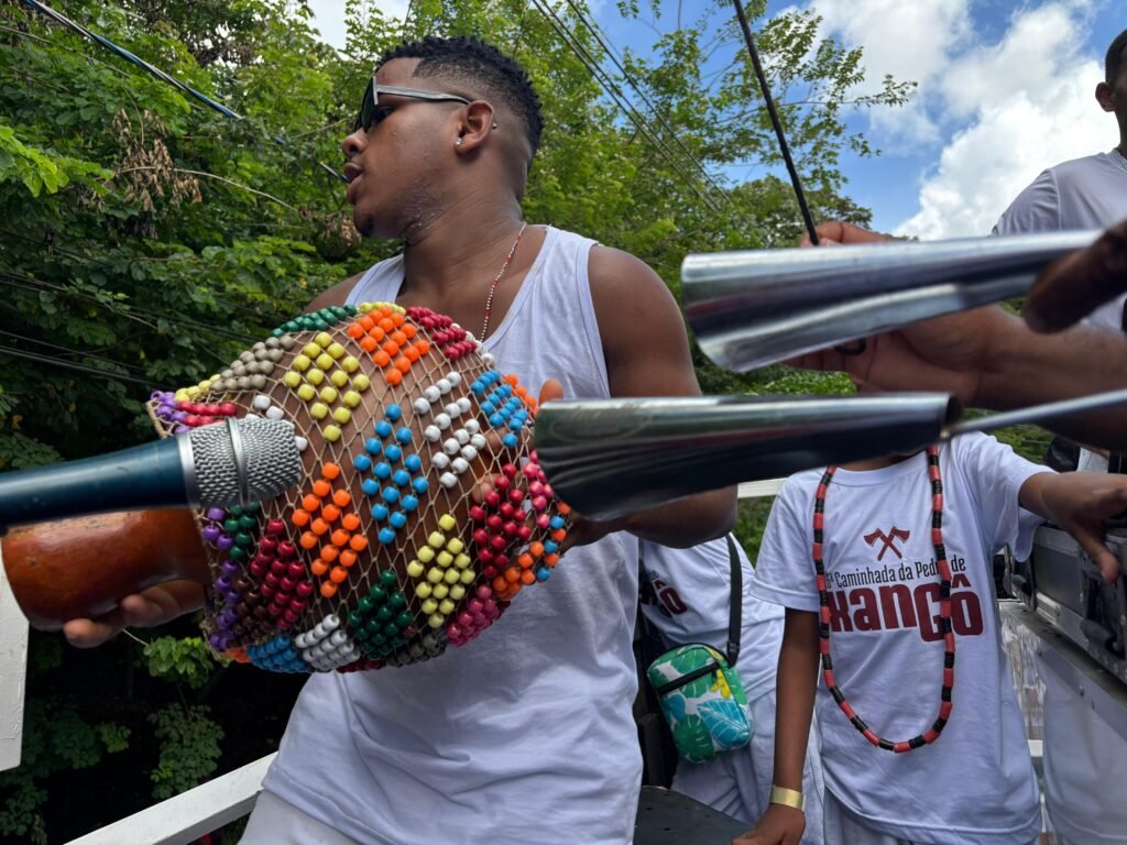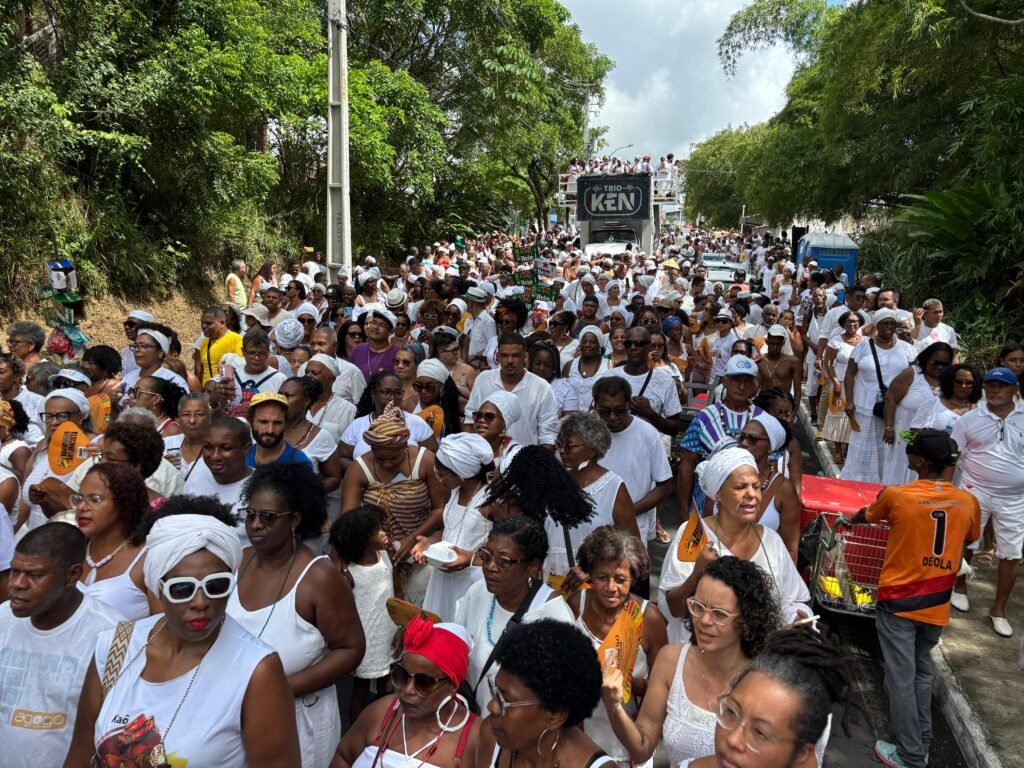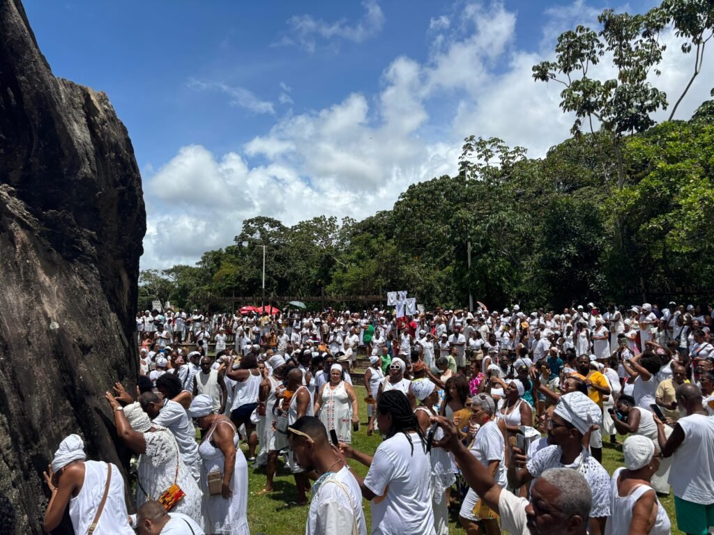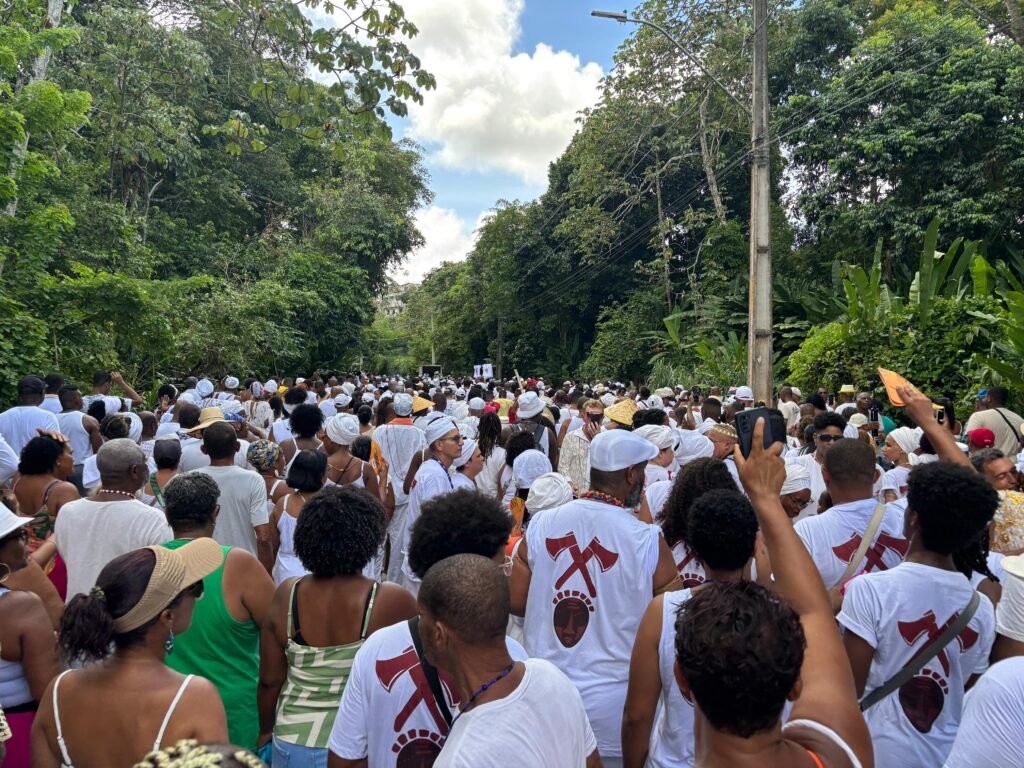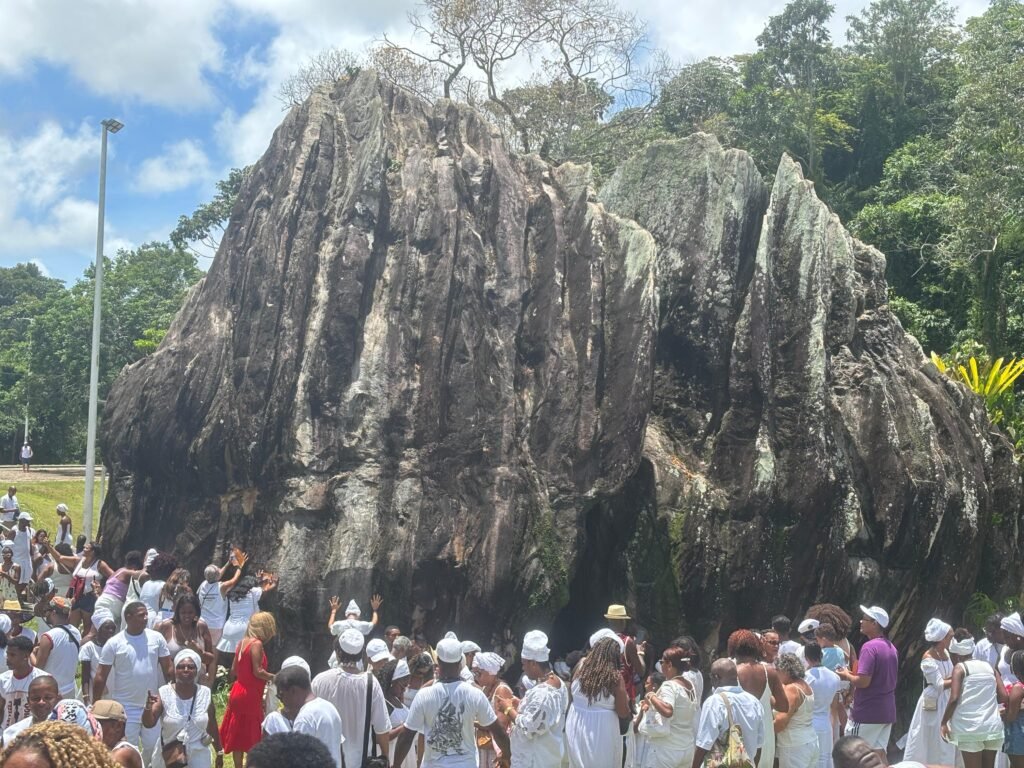 Fé, ancestralidade e resistência marcaram mais um ano da Caminhada da Pedra de Xangô. Vestidos de branco, fiéis percorreram dois quilômetros em homenagem ao patrono da justiça, reafirmando a luta pela preservação desse espaço sagrado. O cortejo terminou no monumento de oito metros de altura, onde oferendas foram entregues e pedidos de bênçãos feitos. No fim, o samba de terreiro tomou conta do Parque Pedra de Xangô, encerrando a celebração com muita energia.