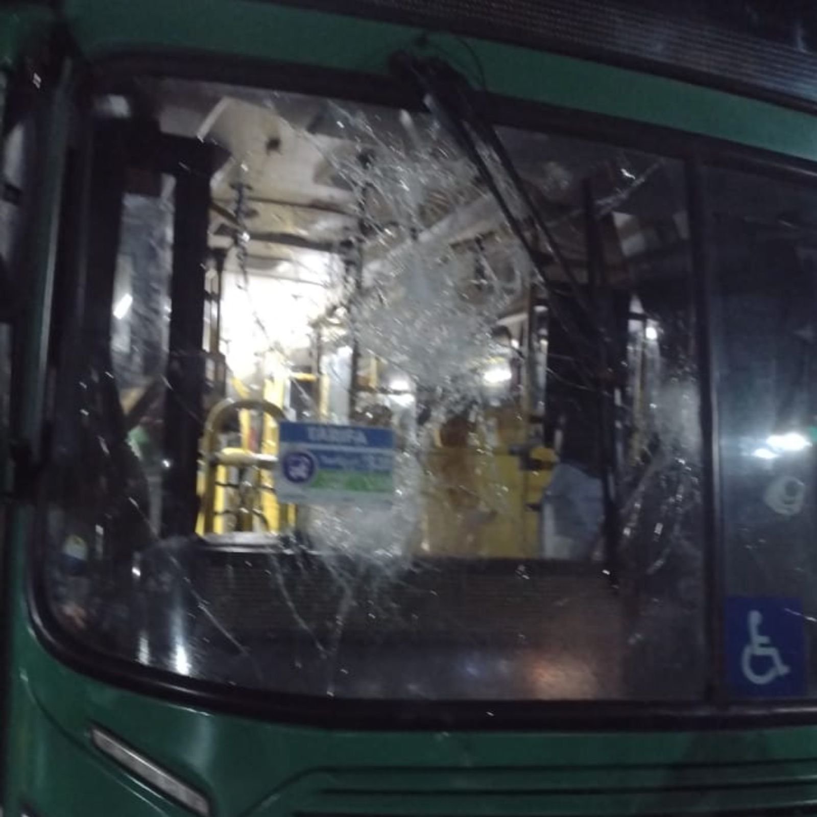 O coletivo teve o para-brisa danificado após criminosos arremessarem pedras contra o veículo, na tentativa de atear fogo. Veja aqui