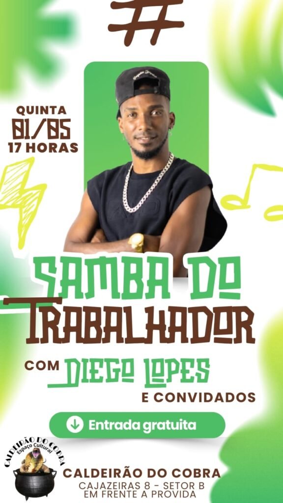 Cajazeiras vai ter samba gratuito no feriado! No dia 1º de maio, o Espaço Cultural Caldeirão do Cobra realiza mais uma edição do Samba do Trabalhador, a partir das 17h, com entrada gratuita.