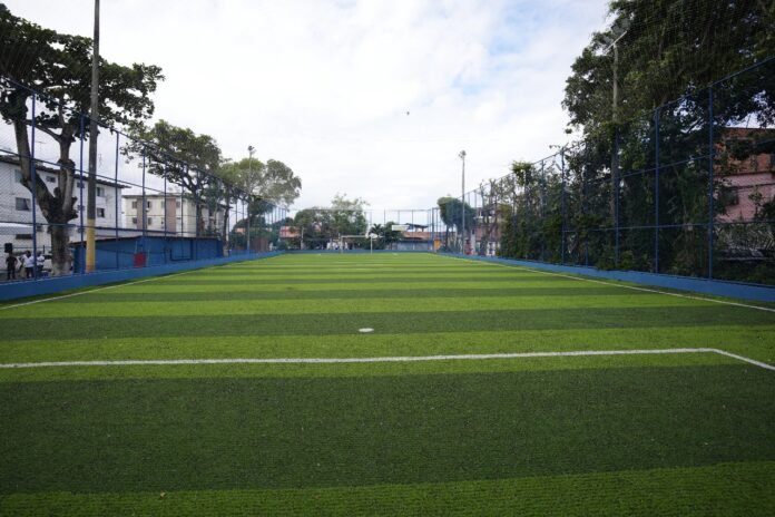 O campo foi construído com sistema de drenagem, camadas de areia e borracha amortecedora, garantindo durabilidade e conforto aos usuários.