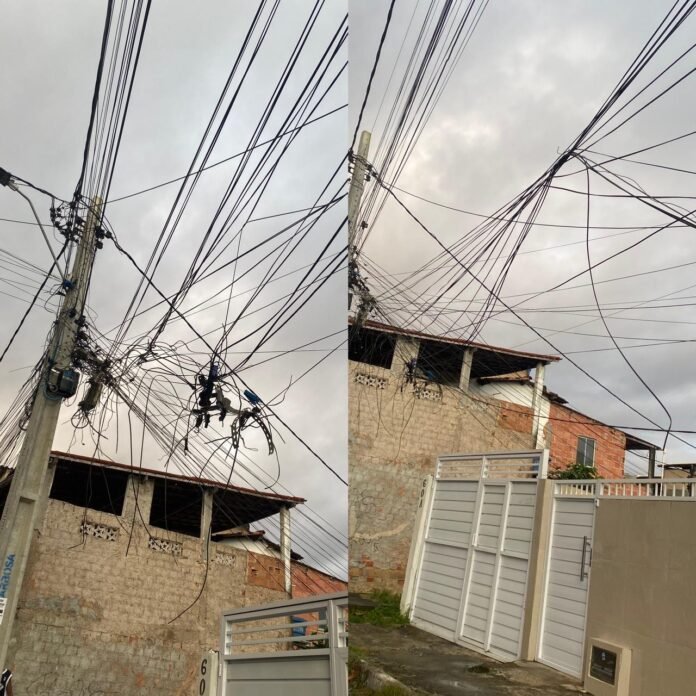 Moradores da Rua Fernando Mascarenhas, no Setor 1, de Cajazeiras 10, enviaram para o Jornalismo do Notícias Cajazeiras, duas imagens que mostram o emaranhado de fios no poste da localidade. De acordo com os moradores, a fiação está baixa e alguns cabos estão soltos, oferecendo perigo para quem transita nas calçadas.