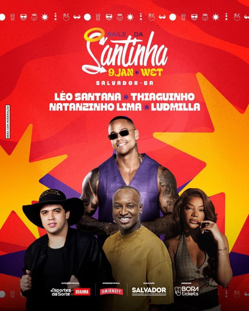 O verão de Salvador vai começar daquele jeito quente: com o Baile da Santinha de volta em edição especial no dia 9 de janeiro, no Wet Eventos. Léo Santana convocou um time de respeito para dividir o palco com ele: Ludmilla, Thiaguinho e Natanzinho Lima.