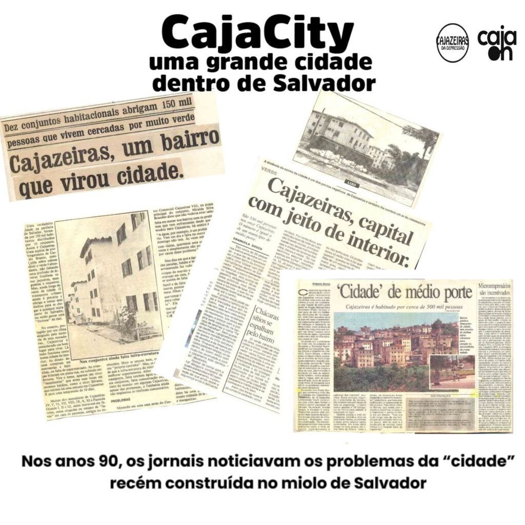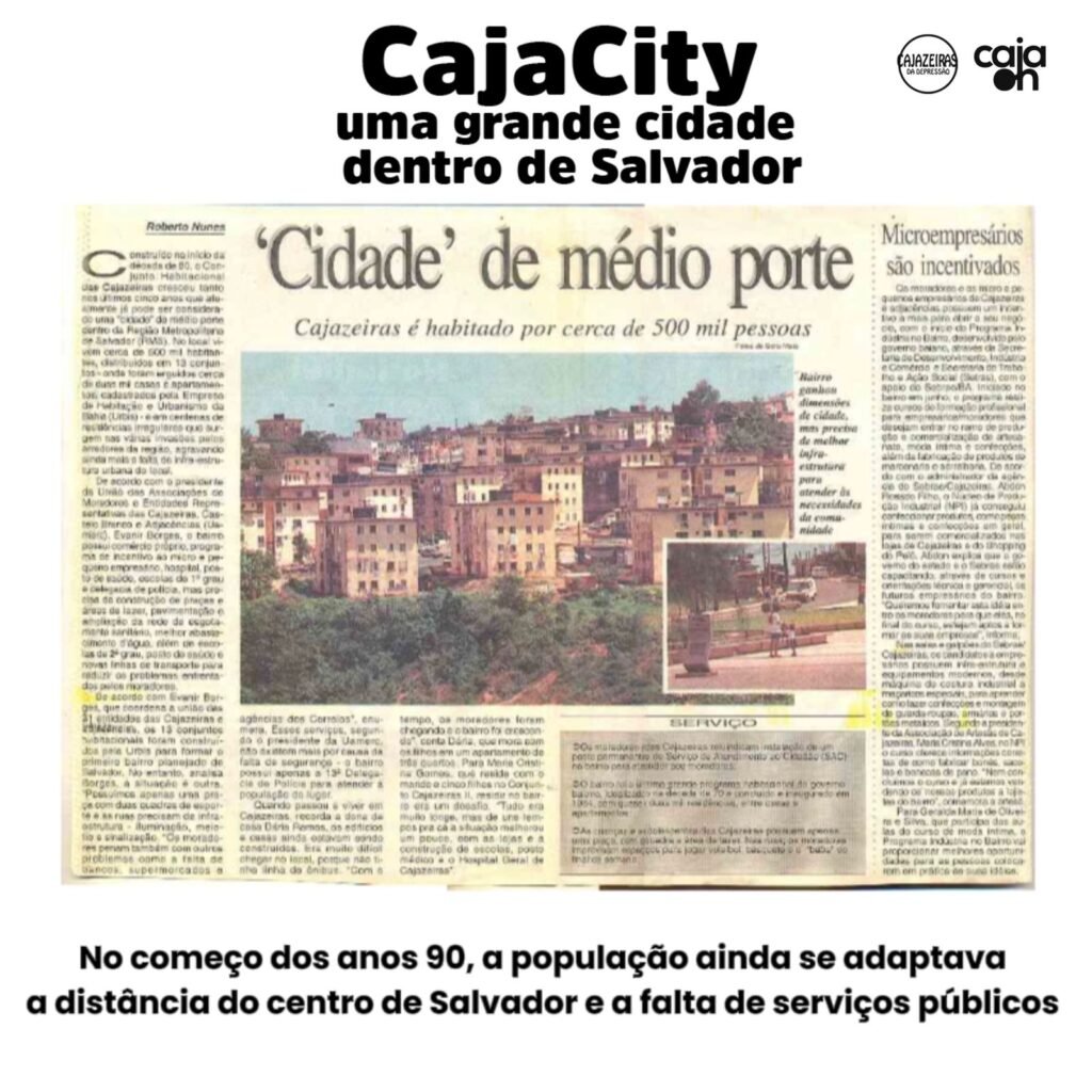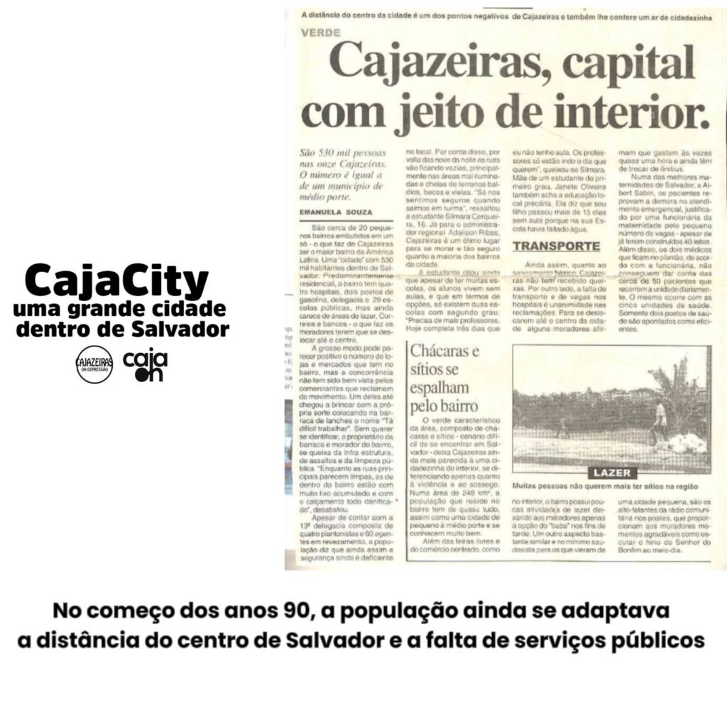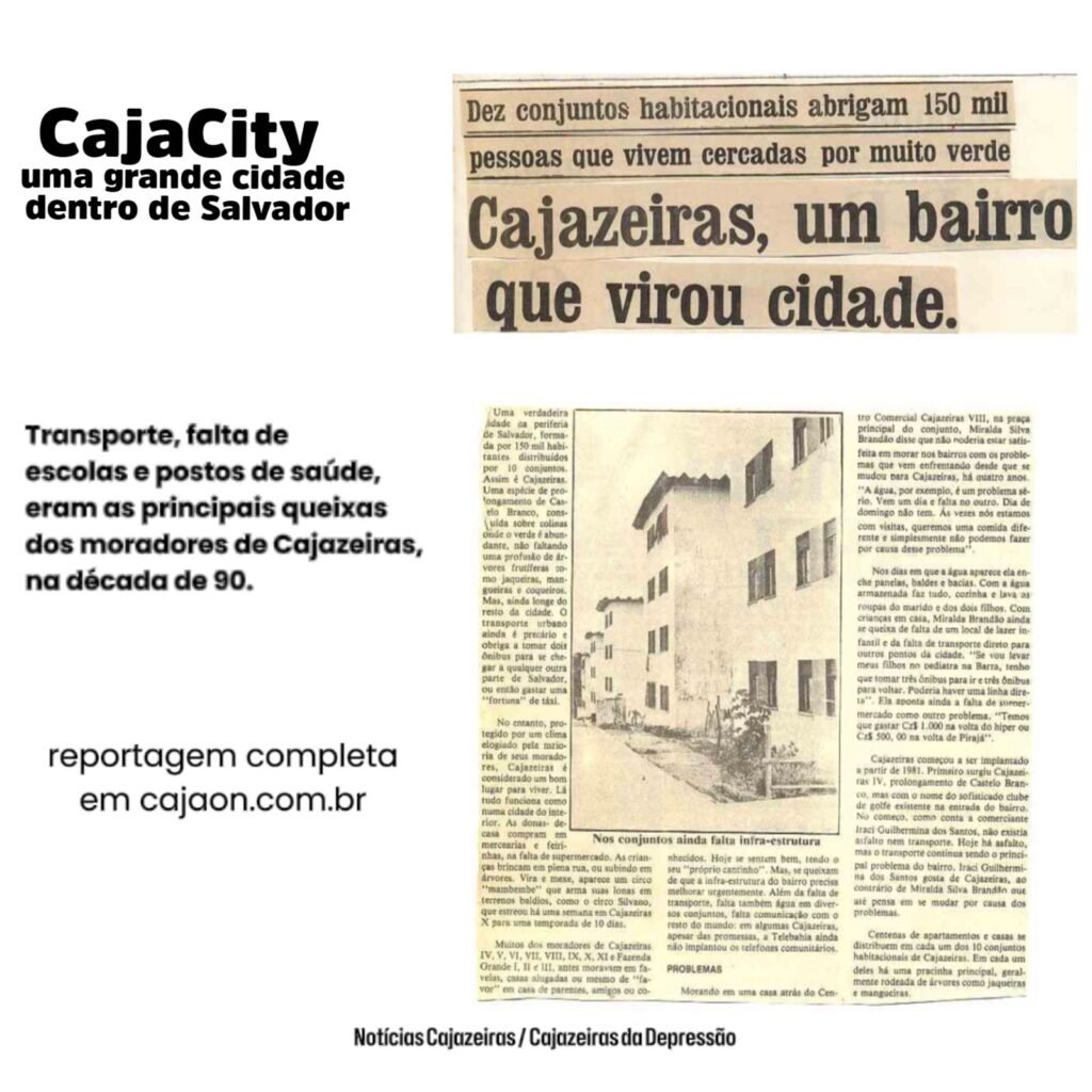 Falta de transporte, segurança, áreas de lazer, postos de saúde e escolas, agências bancárias e serviço dos correios, eram as principais queixas dos moradores da então “cidade”, construída ao longo dos anos 70 e 80, no miolo de Salvador. Com a conclusão dos 18,5 mil casas e apartamentos distribuídos em 13 conjuntos, no começo dos anos 90, os moradores de Cajazeiras que ostentava na época o título de “cidade do inteiror”, devido a distância do centro da capital, sofriam com a falta de alguns serviços na região e isso era estampado nas capas dos principais jornais impressos em circulação na época. A pesquisa feita pelo jornalismo do Notícias Cajazeiras, mostra como as manchetes destacavam Cajazeiras com dimensões de município. Todo complexo habitacional que forma as Cajazeiras, é considerado o maior da América Latina.