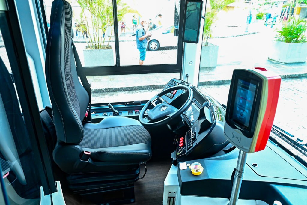 O ônibus também facilita o embarque. Ele tem piso baixo e um sistema que “ajoelha”, inclinando o veículo para o lado da porta — algo que beneficia idosos, pessoas com mobilidade reduzida e quem usa carrinho de bebê.