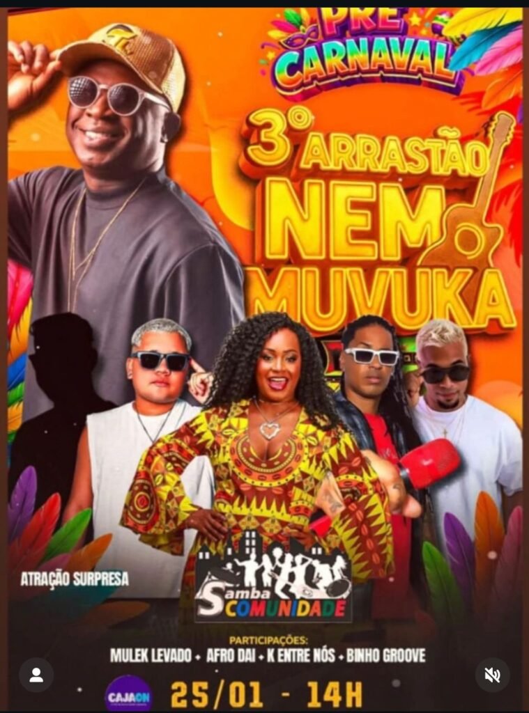 O clima de Carnaval já começou em Cajazeiras. No dia 25 de janeiro, o bairro recebe o 3º Arrastão Nem o Muvuka, dentro da programação do Samba Comunidade, abrindo oficialmente o pré-Carnaval na região.