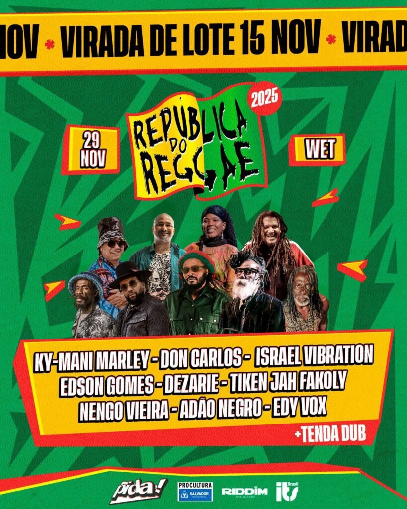 A contagem regressiva para o maior festival de reggae da América Latina já começou! A República do Reggae anunciou a virada de lote no dia 15 de novembro, e os ingressos seguem à venda com condições especiais. O evento será realizado no dia 29 de novembro, no Wet Eventos, em Salvador.