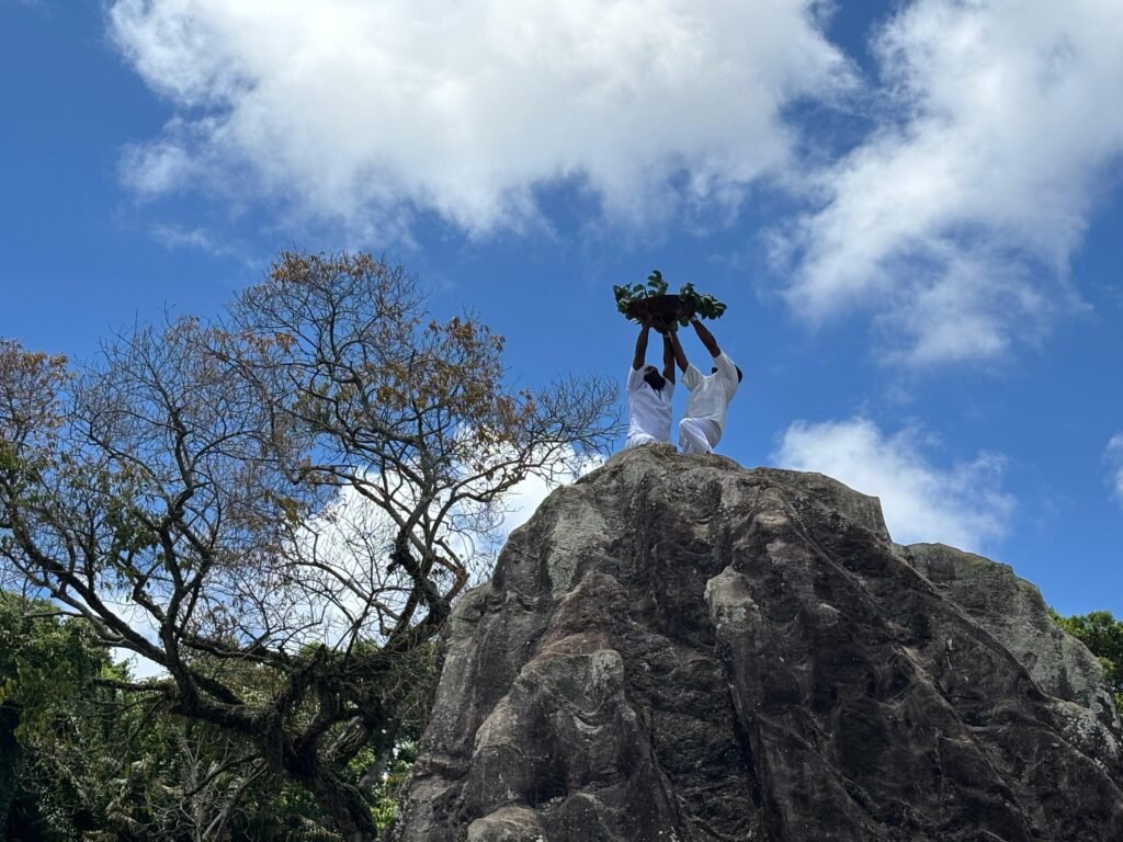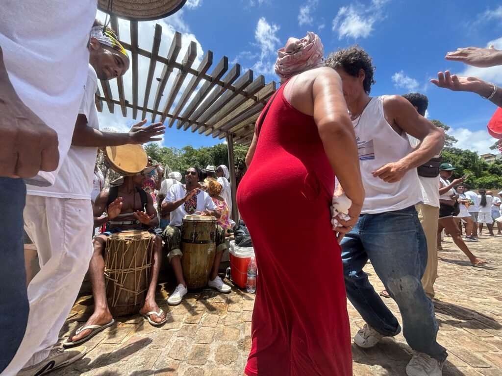 O destino? A imponente Pedra de Xangô, símbolo de força e tradição. Ao chegar lá, uma oferenda foi erguida no alto do monumento de oito metros de altura, enquanto muita gente encostava na pedra para agradecer, pedir bênçãos e renovar as energias.