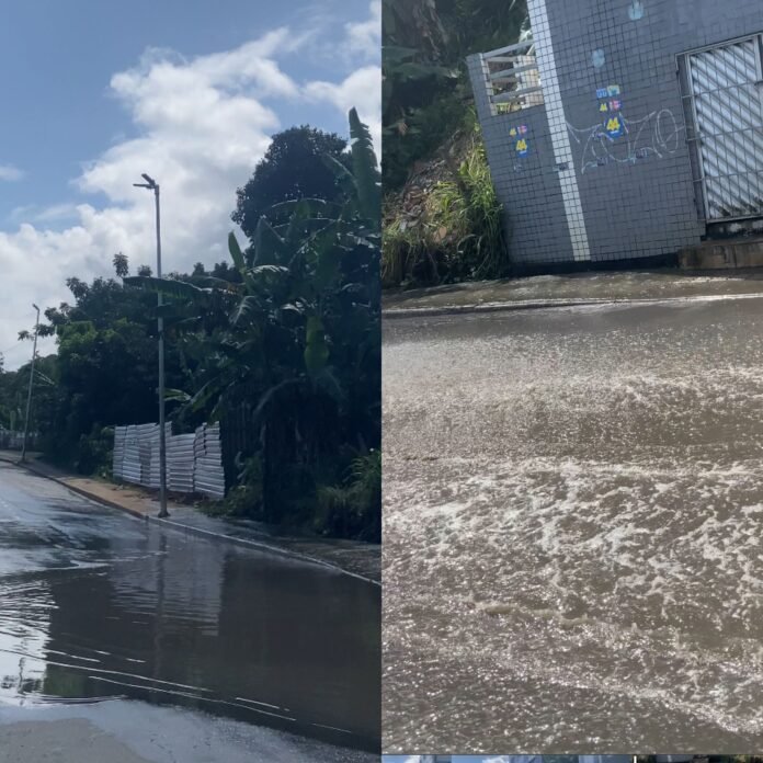 Um vazamento na rede de esgoto deixa parte da Avenida Jorge Calmon de Bittencourt, em Cajazeiras, alagada. De acordo com os motoristas, a situação acontece desde o fim de semana e até o momento não foi resolvida. Com a pista tomada pela água fétida, os carros precisam reduzir a velocidade e utilizam apenas uma faixa das duas faixas da avenida.