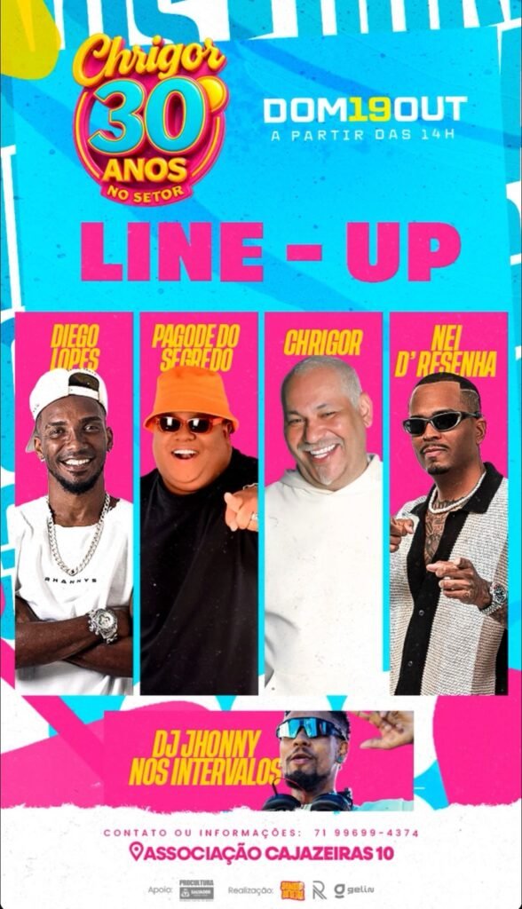 O evento promete muita música, energia e resenha boa. O destaque da festa é Chrigor, ex-vocalista do Exaltasamba, que comemora 30 anos de carreira com os sucessos que marcaram gerações.