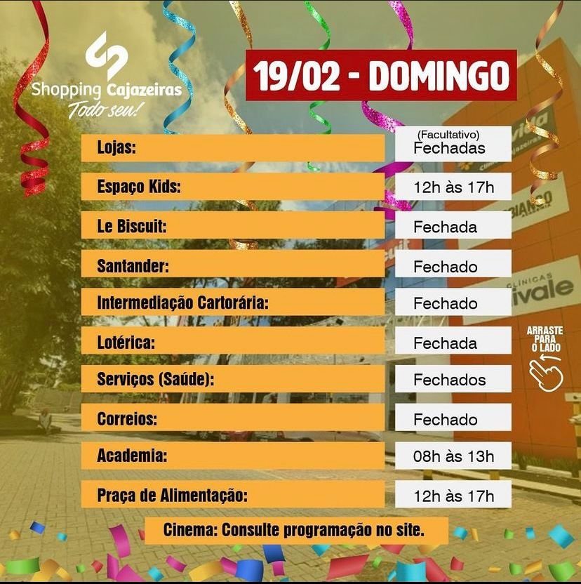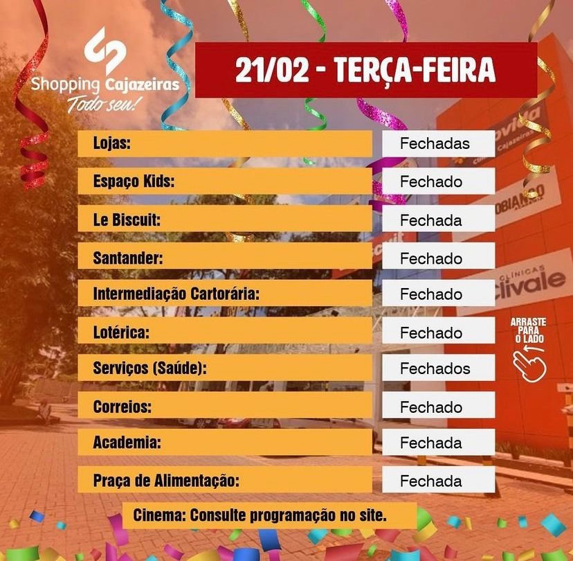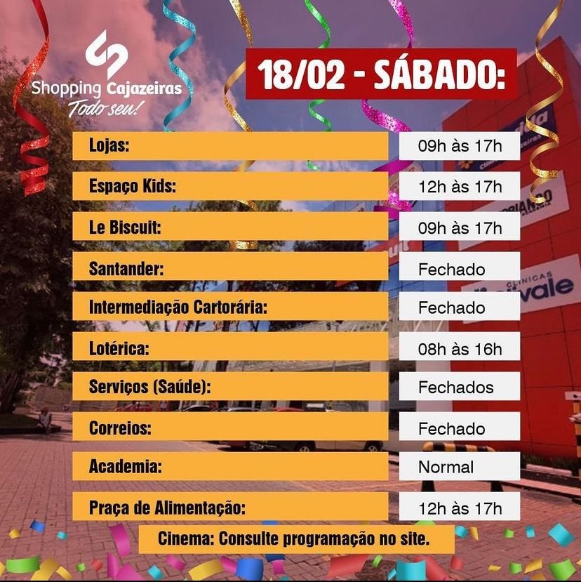@shoppingcajazeiras tem funcionamento especial durante o período do carnaval. Confira abaixo: