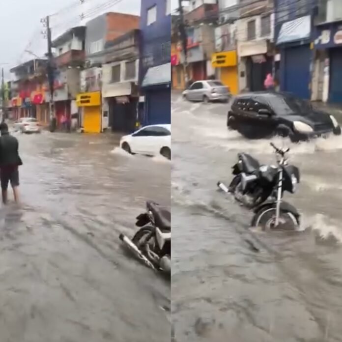 Chuva forte em Cajazeiras 8 expõe descaso com o descarte de resíduos; asfalto sumiu sob a água