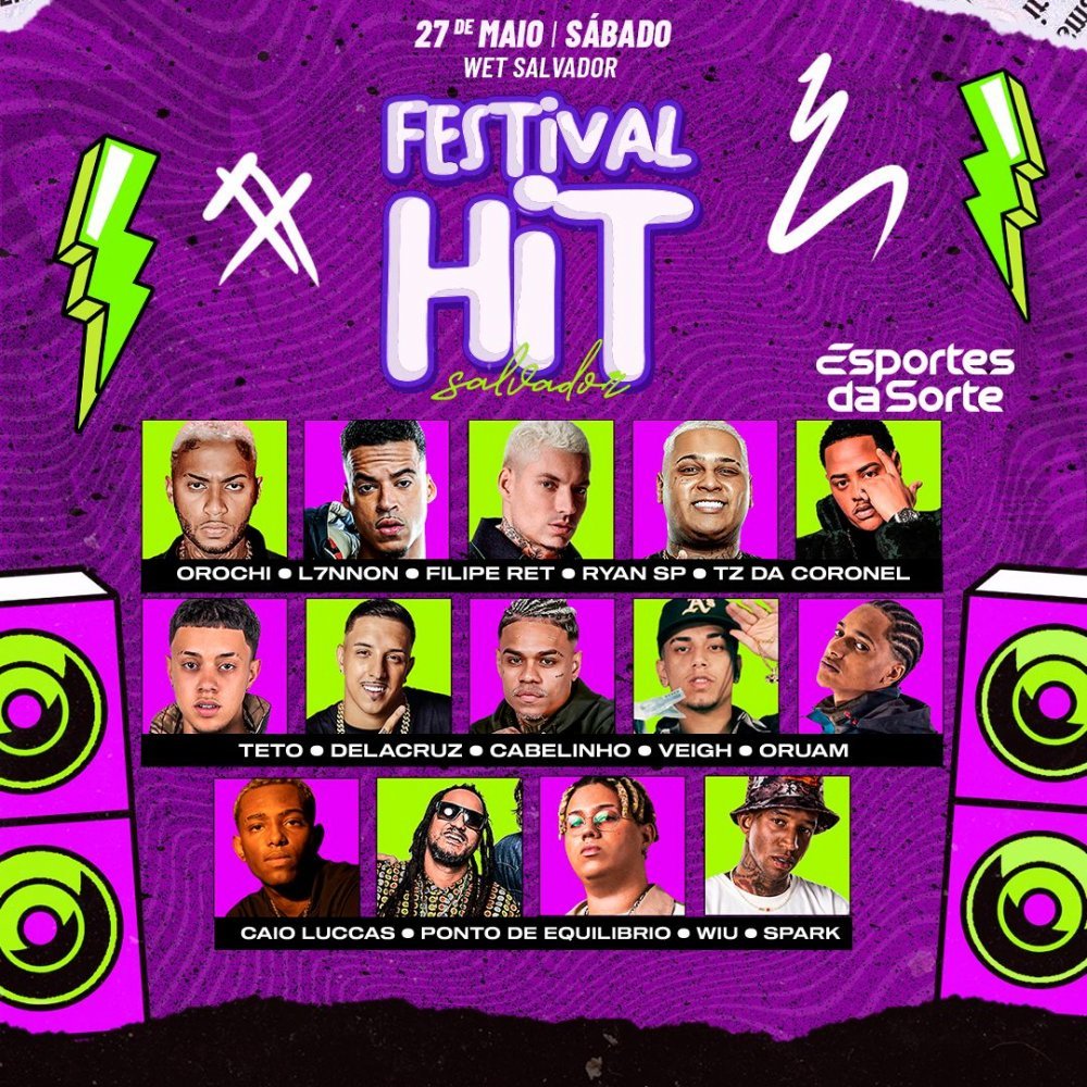 Os amantes de rap, trap, reggae e funk vão curtir bastante no Festival Hit Salvador, que acontecerá no dia 27 de maio, no Wet’n Wild, na avenida Paralela. A segunda edição promete agitar a capital baiana com nomes de peso da música brasileira, como Filipe Ret, L7, Cabelinho, Orochi, Veigh, Caio Luccas, MC Ryan, Oruam, TZ da Coronel, Teto, Wiu, Spark, Ponto de Equilíbrio e Delacruz.