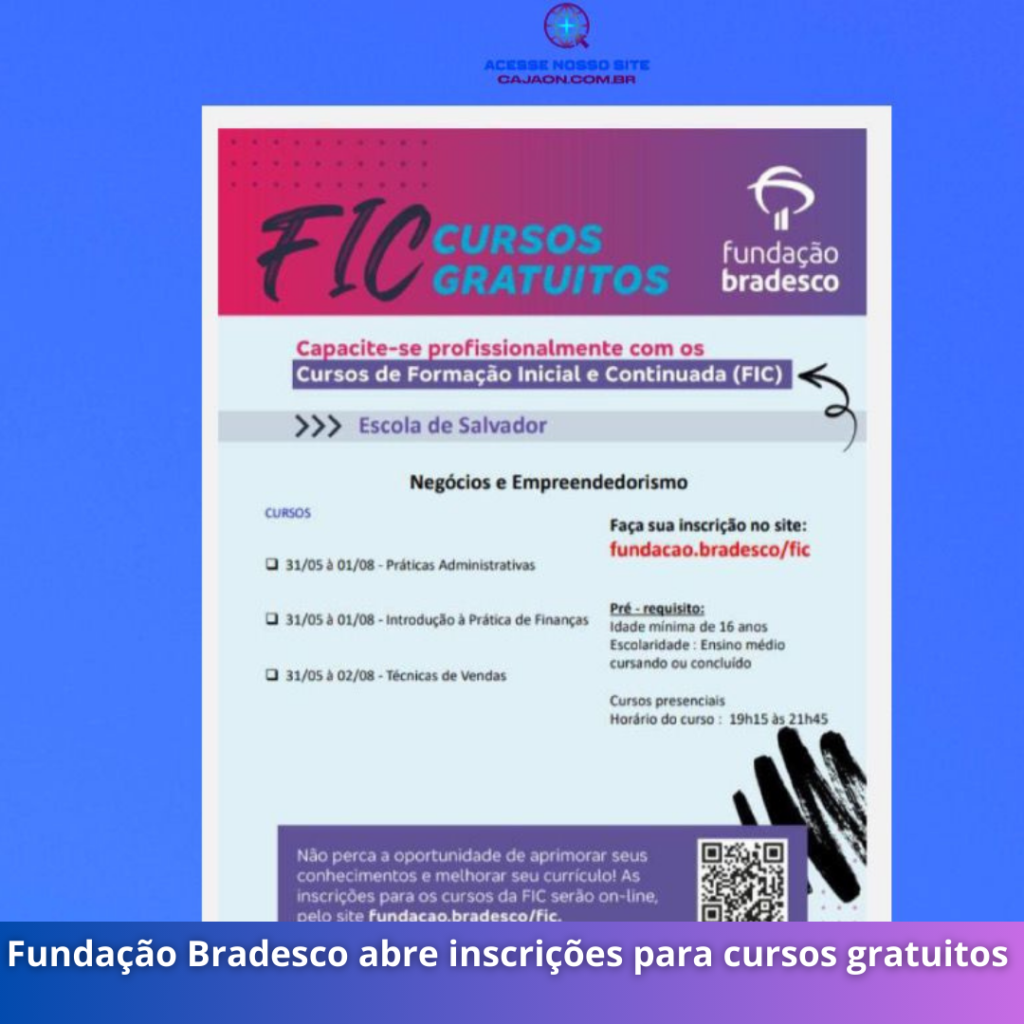 Os cursos gratuitos profissionalizantes presenciais são destinados para pessoas com 16 anos ou mais, que tenham concluído ou cursando o Ensino Médio. As oportunidades são na área de negócios e empreendedorismo. As inscrições podem ser realizadas no site fundacao.bradesco/fic