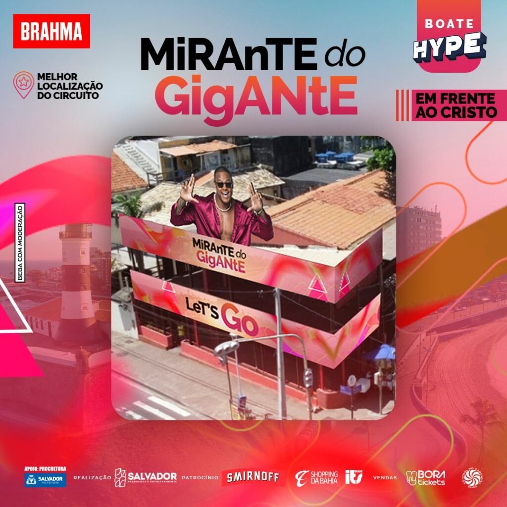 O GG não para e acaba de anunciar mais uma super novidade: O Mirante do Gigante, um dos espaços mais concorridos do Carnaval de Salvador. O Mirante do Gigante desembarca em 2023 em uma das melhores localizações no circuito Barra-Ondina em frente ao Cristo na Barra, uma das vistas mais belas e um dos pontos mais disputados para curtir a folia no carnaval de Salvador.