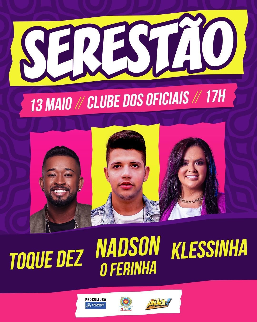 A festa Serestão vai reunir três grandes nomes do cenário da sofrência em uma noite para arrochar muito, trazendo Klessinha, Nadson o Ferinha e a banda Toque Dez, a festa promete animar o público que ama beber e curtir ao som de um dos ritmos mais tradicionais da Bahia, a seresta!